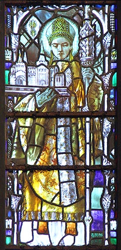 The Roman Catholic Metropolitan Cathedral of St. Chad stands in the center of the huge city of Birmingham. It was built early in the 1840s according to the design of Augustus Pugin—one of the first Catholic grand churches constructed after the repeal of the Penal Laws. It is here that for the past 170 years a portion of St. Chad’s holy relics has been venerated, especially on his feast-day, with prayers and processions. They are enshrined in a golden reliquary above the high altar, in a place of honor. The shrine was built in accordance with the description by Bede of the saint’s original shrine. St. Edward’s Chapel at the Cathedral has a set of stained glass images relating the long story of the wanderings of Chad’s relics between the Reformation and their arrival in Birmingham. In the late twentieth century, the relics were carbon-dated by Oxford University and appeared to be of the seventh century, the time of St. Chad. This bright and graceful Cathedral also has a sixteenth-century statue of St. Chad holding a model of Lichfield Cathedral, cozy side-chapels for quiet prayer, and other sights. In 1940, during the Second World War, one bomb went through the roof of this Cathedral, but bounced from the floor to central heating pipes, causing water to burst from the pipes and extinguish the fire. It was a miracle of St. Chad that the damage was not so serious.