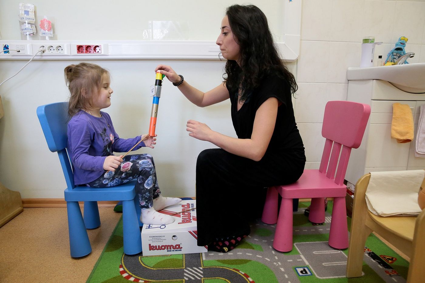 На втором этаже центра реабилитации находится кабинет арт-терапии и социальной адаптации. Здесь живут куклы, игрушечные утюжки и кастрюльки – дети «варят» кашу и укладывают спать Лялю. Каждое действие имеет определенный смысл. Например, чтобы «сварить кашу», нужно рассортировать фасоль и гречку, выбрав крупу, – так развивается мелкая моторика. Вот на занятие приводят Сашу. Она сонная и не хочет возиться с фасолью и играть с Лялей, зато утюжок ее заинтересовал: можно нажать на кнопку и послушать веселую мелодию.