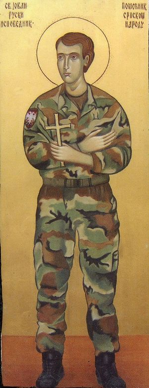 И, как рассказали нам монахини, святой Иоанн Русский явился одному горячо молившемуся сербскому монаху со Святой Горы, будучи облаченным именно в сербскую военную униформу. Святой сказал: «Иду помочь братьям-сербам». На следующий день, 10 июня 1999 года, бомбардировки НАТО прекратились…