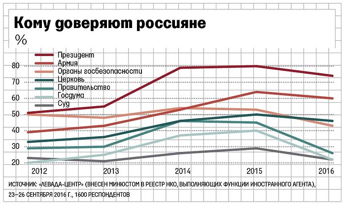 В отдельные периоды уровень абсолютного доверия граждан России (ответ: «Полностью доверяю») выводит Церковь на место института с максимальной поддержкой (данные РОМИР от 2013 г.).