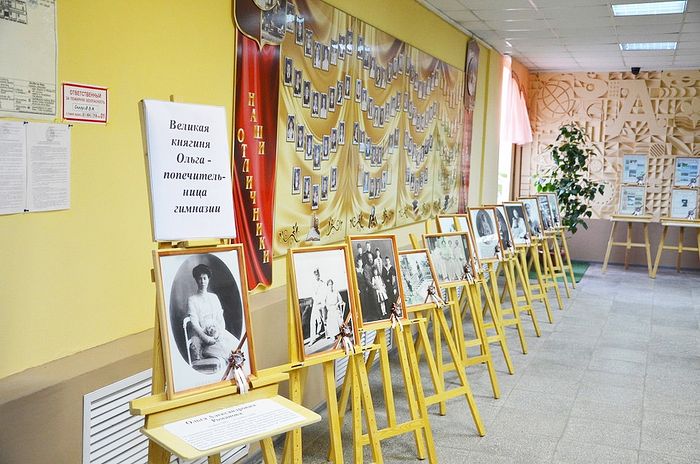 Директор школы И.А. Хатунцева и учащиеся тепло приветствовали почетных гостей. Инна Алексеевна рассказала им об истории учебного заведения, вручила памятные подарки. Владыки и руководители в фойе школы ознакомились с выставкой редких фотографий Великой княгини Ольги и дома Романовых.