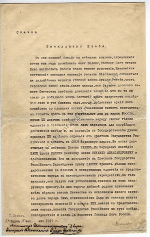 ... Нужно мое отречение. Рузский передал этот разговор в ставку, а Алексеев всем главнокомандующим. К 2 1/2 ч. пришли ответы от всех. Суть та, что во имя спасения России и удержания армии на фронте в спокойствии, нужно решиться на этот шаг. Я согласился. Из ставки прислали проект манифеста. Вечером из Петрограда прибыли Гучков и Шульгин, с которыми я переговорил и передал им подписанный и переделанный манифест. В час ночи уехал из Пскова с тяжелым чувством пережитого.