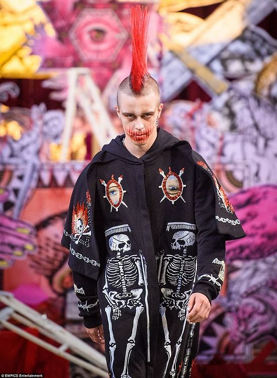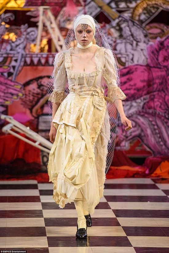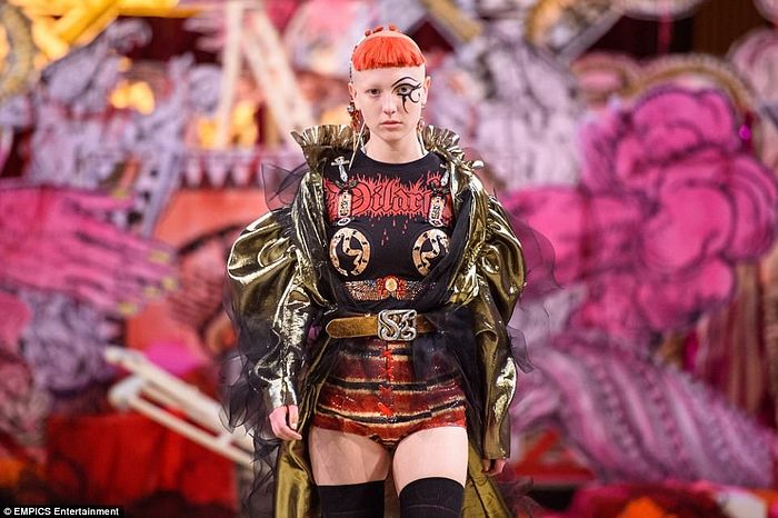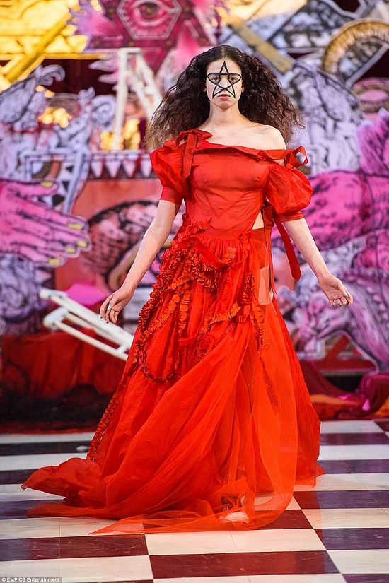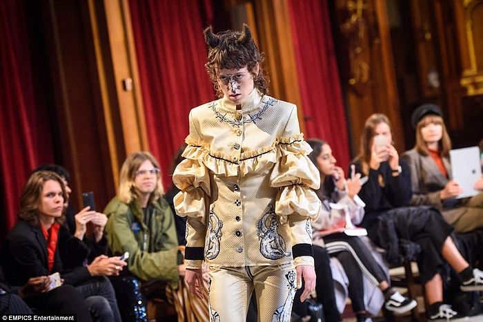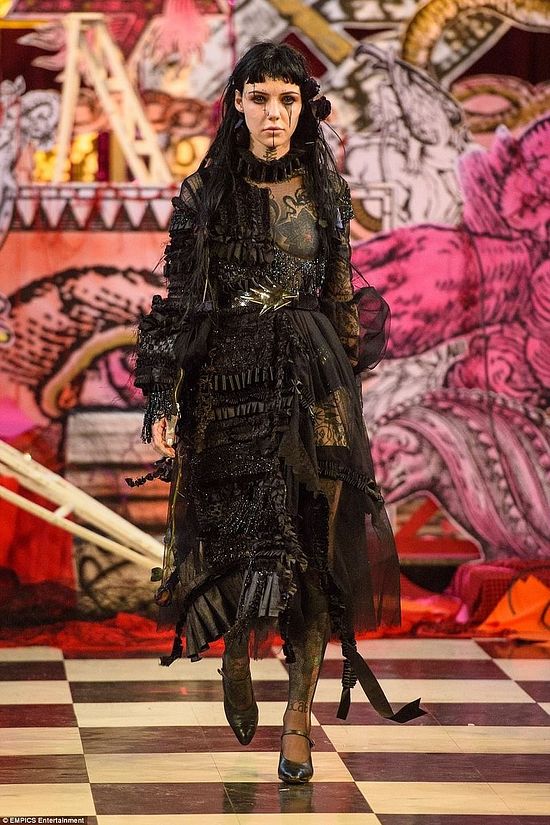 Эта модель идет по подиуму с парой «рогов», сделанных из волос. На ее лице также запечатлен знак сигил.