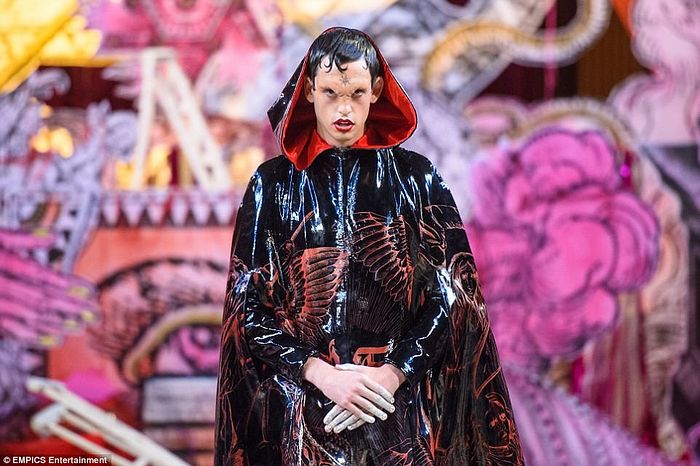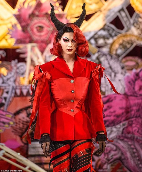 Трансвестит под псевдонимом «Вайолет Чачки» появился (или появилась!) в ярко красном наряде и… рогами черта. И все это происходит внутри храма! Исторически «черная месса» – это ритуал, являющийся антиподом, профанацией латинской мессы Римско-католической церкви и сопровождающийся осквернением христианских объектов в сатанинских целях. То, что модели ходят в церкви (христианское сакральное пространство) с диавольскими рогами на голове, сильно напоминает концепцию «черной мессы».