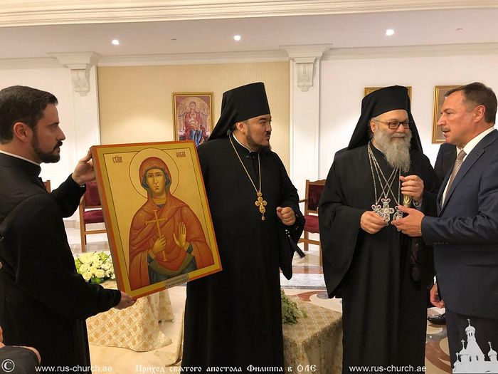 В присутствии Чрезвычайного и Полномочного посла России в ОАЭ Александра Ефимова настоятель русского храма святого апостола Филиппа в городе Шарджа преподнес Предстоятелю Антиохийской Церкви храмовый образ святой равноапостольной Феклы. Икона передана для монастыря святой равноапостольной Феклы в Маалюле, освобожденного от боевиков ИГИЛ (террористическая организация запрещена в РФ).
