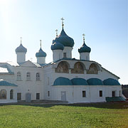Общий вид Троицкого комплекса. На переднем плане — братские корпуса | Троицкий собор, в котором находятся чудесно обновляющиеся фрески | Старинная церковь Троицкого комплекса |