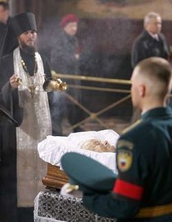 «Панихиду в Храме Христа Спасителя будут служить митрополит Крутицкий и Коломенский Ювеналий, митрополит Смоленский и Калининградский Кирилл, митрополит Калужский и Боровский Климент и священники Храма Христа Спасителя, - сказал "РГ" заместитель председателя Отдела внешних церковных связей Московской Патриархии протоиерей Всеволод Чаплин. - Перед этим состоится прощание. Символично, что главу государства будут отпевать в храме и прощаться с ним там же. Этого не было со времен кончины императора Александра III».