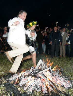Президентская чета приняла участие в традиционных купальских забавах - прыжках через костер и пускании огненного колеса.