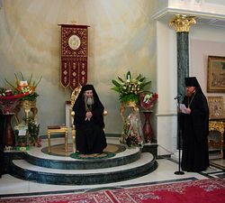 Затем к Предстоятелю Иерусалимской Церкви с поздравительным словом обратился Генерльный Консул Греции в Иерусалиме. От имени Русской Православной Церкви Патриарха Феофила поздравили начальник Русской Духовной Миссии в Иерусалиме архимандрит Тихон (Зайцев) и настоятельница Горненского монастыря игумения Георгия (Щукина), сопровождаемые членами Миссии и сестрами монастыря.