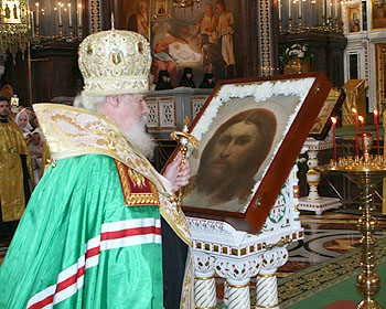 Молебен был совершен перед иконой Нерукотворного Образа Спасителя, которая хранилась в первом Храме Христа Спасителя до его разрушения в 1931 году.