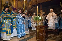 Митрополиту Илариону сослужили архиепископ Берлинский и Германский Марк, епископы Домодедовский Евтихий, Женевский и Западно-Европейский Михаил, Штутгартский Агапит, наместник Сретенского монастыря архимандрит Тихон (Шевкунов) с братией в священном сане и клирики Русской Православной Церкви за границей: протоиереи Александр Лебедев, Петр Холодный и Серафим Ган. За литургией молился архиепископ Йошкар-Олинский и Марийский Иоанн.
