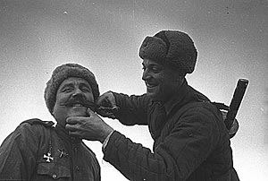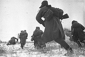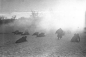 «Атака», «Наступление», еще одно, еще. Кадры сражений, напряженных и страшных атак, пулеметных очередей, взметающих снежную пыль, перемежаются снимками с веселыми улыбающимися лицами солдат, еще не знающих о своем завтра.