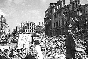 Рядом другое фото. Опять развалины, останки некогда жилых домов. Художник в белой чуть пузырящейся на ветру рубахе и в черном классическом берете пишет картину. Любопытный военный из-за его плеча следит за мыслью художника. Где это? Так ли важно - в освобожденном ли Бухаресте или во взятом Берлине?