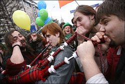 Если читатель предполагает, что эта сцена происходила в средневековье, где-нибудь на сельском празднике в глухой деревушке Горной Шотландии, то он ошибается. Все описанное имело место в марте прошлого года в центре Москвы, в самом начале улицы Новый Арбат, и называлось празднованием дня святого Патрика (далее – ДСП). Наблюдать шокирующее зрелище могли тысячи горожан, которые, откликнувшись на активную рекламу предстоящего действа, пришли на него целыми семьями. Конечно, формально программа праздника не включала в себя группового эксгибиционизма, наоборот, все выглядело вполне пристойно: парад с участием клубов любителей средневековой истории и поклонников кельтской культуры. К сожалению, проявление любви к кельтам и их истории вылилась в нечто иное, культуре прямо противоположное.