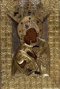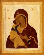 1. Богоматерь Владимирская. Икона-список в серебряном окладе. Храм Христа Спасителя В марте 2007 года в Москву вернулась Владимирская икона Божией Матери (ил. 1), вывезенная из России в 1920-е годы и в течение многих лет находившаяся за рубежом. Отечественные благотворители, заботящиеся о возвращении святынь в Россию, выкупили икону и передали ее Полномочному представителю Президента России Георгию Сергеевичу Полтавченко. Вечером 7 апреля 2007 года перед началом пасхального богослужения великого праздника светлого Христова Воскресения в храме Христа Спасителя Владимир Путин, тогдашний Президент России, торжественно преподнес Владимирскую икону Божией Матери Святейшему Патриарху Московскому и всея Руси Алексию II. Древняя святыня вернулась в лоно родной Русской Православной Церкви и была поставлена в храм Христа Спасителя.