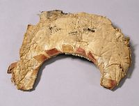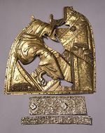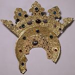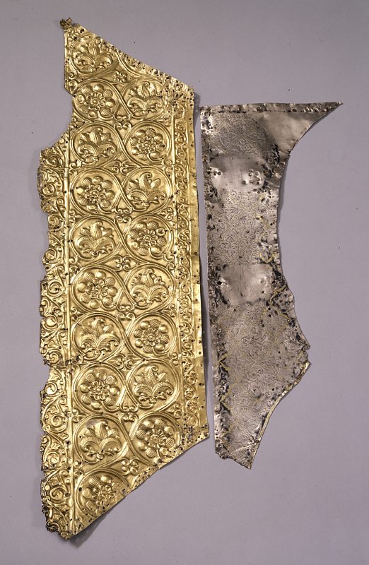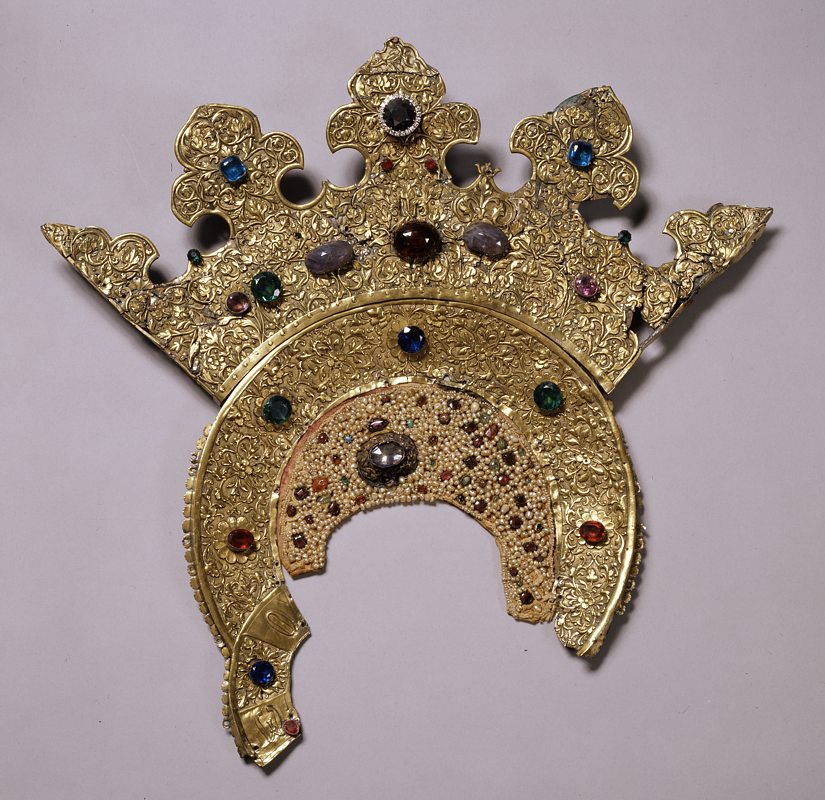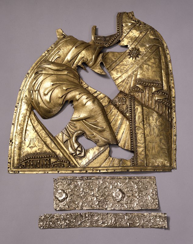 3. Серебряные риза и пластины басмы, снятые для экспертизы с иконы На возвращенной «Богоматери Владимирской» сохранилось ее драгоценное убранство, благодаря которому икона получила особую историческую, художественную и материальную ценность. Массивный серебряный оклад составлен из нескольких разновременных частей: на широких полях – золоченая басма с очень крупным орнаментом-плетенкой, на фоне средника – серебряные пластины с тонкой гравировкой, на одеждах Богородицы и Младенца Христа – рельефная золоченая риза (ил. 1–3). Двойной золоченый серебряный венец с чеканным растительным узором и «городчатая» (с трехлепестковыми зубцами) корона Богородицы украшены крупными сверкающими камнями; очелье низано жемчугом и мелкими цветными камнями (ил. 4). На тыльной стороне иконы (на обороте) написан Престол Уготованный с орудиями Страстей Христовых (ил. 5).