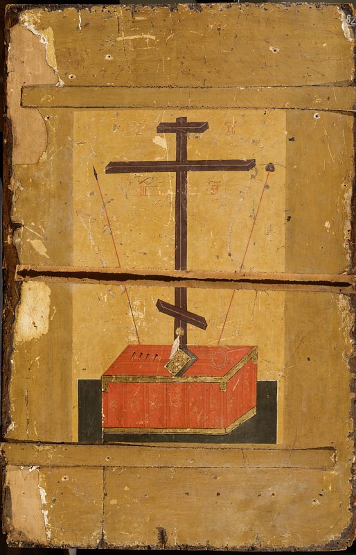 Доска с тыльной стороны скреплена тремя шпонками, средняя из которых утрачена. Эти шпонки не первоначальные. Верхняя и нижняя, вероятно, появились на месте старых шпонок, средняя шпонка была поставлена заново при одном из поновлений иконы. Шпонки стесаны заподлицо, доска пролевкашена для нанесения изображения. В местах утрат левкаса до доски (особенно обширных слева) видна паволока грубого плетения. В верхнем углу справа на паволоке белилами написаны цифры «82», вероятно обозначающие порядковый номер иконы по какому-то списку. Верхний красочный слой на тыльной стороне иконы относится к одному из последних поновлений. Коричневой охрой имитированы широкие поля, соответствующие полям на лицевой стороне. Между верхней и нижней шпонками на светло-охристом фоне изображен Голгофский крест с орудиями Страстей Христовых, поставленный за престолом с красным покровом на нем. Из-под охряного цвета полей и средника в местах утрат проступает более светлый красочный слой. На полях имеются крупные отверстия с выпадами грунта. Вероятно, это следы крепления либо оклада, либо рамы.