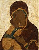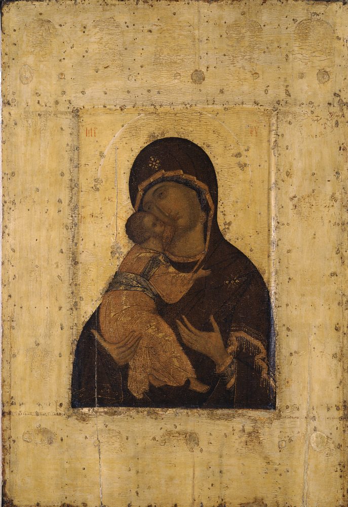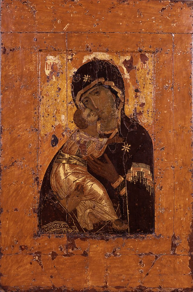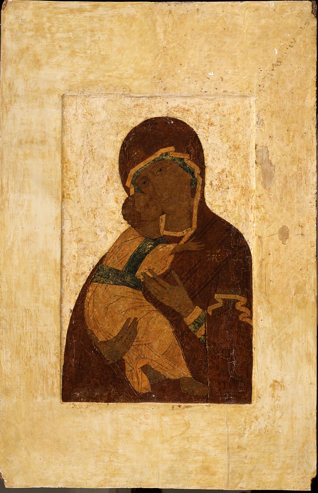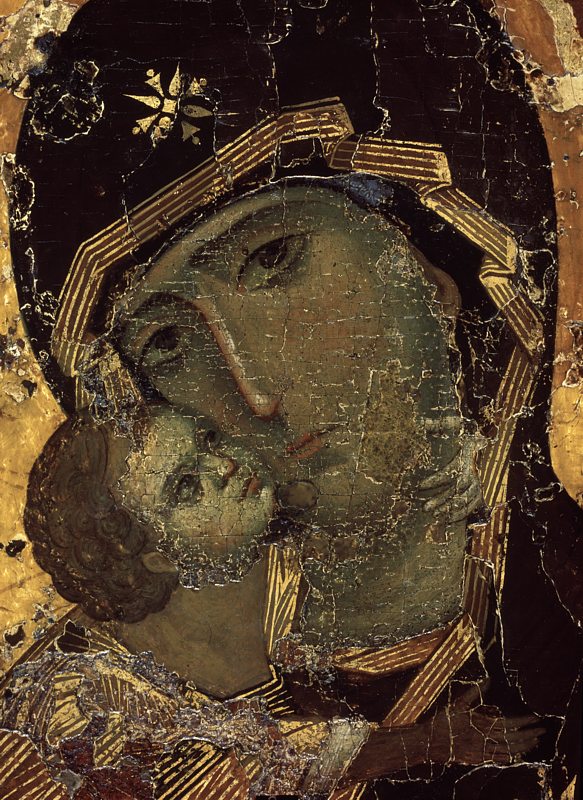 Высокое качество реставрации иконы хорошо соотносится с надписью на тыльной стороне очелья Богоматери, в которой читается фамилия «Тюлин». По всей вероятности, икону реставрировал Михаил Иванович Тюлин, поскольку Александр Алексеевич Тюлин, начиная с 1918 года и до самой своей преждевременной смерти в 1920 году, раскрывал иконы в Троице-Сергиевой лавре[4]. Согласно «Инструкции по расчистке икон и стенописей» 1918–1919 года, при реставрации не допускались «никакие записи, доделки или поправки утраченных частей древней живописи», лишь в исключительных случаях, при очень больших утратах, разрешалось «погашение» белых пятен левкаса, но с тем условием, «чтобы рисунок и форма не восполнялись и погашенное место не сливалось с первоначальной живописью»[5]. Реставрация «Богоматери Владимирской» в целом выполнена в соответствии с инструкцией. Однако состояние авторского красочного слоя иконы было таково, что требовался индивидуальный подход. Для того чтобы сохранить икону как целостное произведение и моленный образ, необходимы были реставрационные тонировки по всей поверхности, прописи контуров, а также деликатное восстановление черт ликов. Эта труднейшая задача была выполнена с исключительным мастерством и совершенством, с глубоким проникновением в самую суть образа, благодаря чему в восстановленных формах хорошо выявлено его духовное содержание. В этой иконе, учитывая ее руинированное состояние, реставратор-иконописец удачно совместил принципы научного раскрытия икон, принятые Комиссией по сохранению древней живописи, и необходимые в данном случае приемы антикварной реставрации.