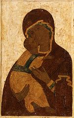 11. Престол Уготованный с орудиями Страстей Христовых. Начало XV в. Оборот чудотворной иконы «Богоматерь Владимирская» первой трети XII в. О происхождении возвращенной иконы нет никаких исторических сведений. Для уточнения ее датировки, выявления обстоятельств ее написания и обоснования предположений о ее происхождении необходимо кратко рассмотреть основные этапы поновления и прославления древней чудотворной «Богоматери Владимирской», поскольку именно в эти периоды создавались ее точные списки «в меру и подобие».