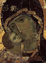 10. Богоматерь Владимирская. Чудотворная икона. Деталь: лики Размеры доски, пропорции широких полей, иконография и композиция лицевой и оборотной сторон рассматриваемой иконы полностью соответствуют древней чудотворной «Богоматери Владимирской» (ил. 9, 11). Изображение Богоматери поясное, с Младенцем Христом, сидящим на Ее правой руке (слева). Голова Богоматери склонена к Сыну, прильнувшему ликом к Ее щеке и левой рукой обнимающему Мать за шею под мафорием. Левая рука Богородицы поднята, пальцы касаются широкого рукава рубашки Иисуса: Мария поддерживает Младенца-Сына и одновременно обращается к Нему с молитвой, являет миру Спасителя. Правая рука Христа простерта, лежит на груди Богоматери. Он облачен в длинный охристо-желтый хитон с золотым ассистом, закрывающий Его фигуру до ступней. Правая нога Младенца вытянута, ступня нарисована параллельно иконной плоскости (в профиль); левая нога подвернута, из-под складок одежды видна ее подошва. Мафорий Богородицы коричневый, с темными (черными) линиями складок и охряной каймой с золотым ассистом. Чепец и рукав хитона сине-зеленого цвета. На рукаве две охряные полосы, аналогичные окаймлению мафория. Препоясание Младенца Христа такого же сине-зеленого цвета, как и чепец Богоматери.