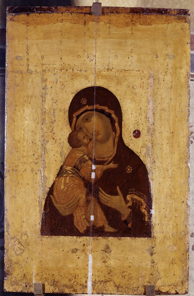 Подобно другим древним святыням, вернувшаяся в Россию икона в течение своей долголетней жизни претерпела многочисленные повреждения от перепадов температуры, от пламени и копоти свечей, от креплений оклада и других неблагоприятных для ее сохранности факторов. В результате ее древняя живопись оказалась сильно утраченной. Левкас (грунт) во многих местах разрушился (особенно справа внизу вдоль трещины по стыку досок) и был заменен новым; на вставки левкаса нанесли новый красочный слой. Поля иконы полностью перелевкашены (наложен новый слой грунта), на основном слое левкаса имеются вставки, наиболее крупные – в середине правого поля. На полях видны следы от гвоздей современного оклада (хорошо просматривается диагональный стык верхней и боковой пластин оклада вверху справа). Фон средника состоит из многочисленных разновременных левкасных вставок. Вставки левкаса имеются и на фигурах, особенно на одеждах Богоматери внизу справа и вдоль трещин. Авторский красочный слой очень сильно потерт и разрушен, по существу от него остались лишь фрагменты, умело и деликатно собранные общим тоном, благодаря чему реставратору удалось полностью восстановить первоначальный облик иконы, не прибегая к сплошным прописям «в стиле оригинала», что было характерно для антикварной реставрации конца XIX – начала XX века. Реставрация этой плохо сохранившейся иконы, в течение веков своего существования, видимо, многократно подвергавшейся чисткам и поновлениям, выполнена профессионально, на очень высоком уровне, сопоставимом лишь с классическими реставрациями древних икон искусными мастерами Комиссии и ЦГРМ, работавшими в 1918–1934 годах.