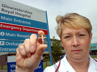 Администрация Королевской больницы Глостершира под угрозой увольнения запретила носить цепочку с нательным крестом 43-летней Хелен Слэттер (Helen Slatter), проработавшей пять лет в отделении забора крови. Причиной запрета стала потенциальная опасность переноса внутрибольничных инфекций, а также тот факт, что пациент может схватить цепочку, нанеся медсестре травму.