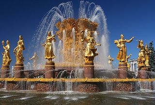 Тогда же на площади Колхозов появился символ выставки – фонтан «Дружба народов»: 16 девушек-колхозниц, олицетворяющих союзные республики, в национальных костюмах ведут хоровод. А далее – фонтан «Каменный цветок», по мотивам бажовских сказок, с декоративными натюрмортами из плодов и овощей. Существует и третий фонтан – «Колос», сделанный в виде пшеничного колоса и считающийся одним из крупнейших в Европе. Высота его центральной струи достигает высоты пятиэтажного дома. Что касается экспозиции, то она строилась по принципу совмещения республиканских и отраслевых павильонов. Чтобы обойти выставку и целиком осмотреть экспозицию потребовалось бы около пяти дней.