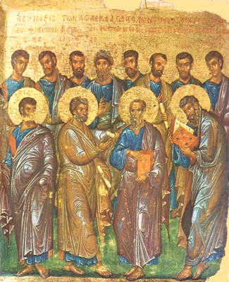 Византийская икона. Начало 14 века. ГМИИ. О странах, в которых проповедовали апостолы, находившихся как в границах Римской империи, так и за ее пределами, известно из «Церковной истории» Евсевия Кесарийского, который опирается на несохранившиеся тексты Оригена из его «Толкования на Бытие»: «Фоме, как повествует предание, выпала по жребию Парфия, Андрею – Скифия, Иоанну – Асия, там он жил, там в Эфесе и скончался; Петр, по-видимому, благовествовал иудеям, рассеянным по Понту, Галатии, Вифинии, Каппадокии и Асии. Под конец жизни он оказался в Риме, где и был распят головой вниз: он сам счел себя достойным такой казни». Произошло это, вероятно, в 67 году, по церковному преданию – 29 июня, ставшем днем памяти первоверховных апостолов Петра и Павла. Апостол и евангелист Матфей из Капернаума проповедовал в Сирии, Мидии, Персии и Парфии, закончив свой земной путь в Эфиопии, где, по церковному преданию, принял мученическую смерть на костре в 60 году. Апостол Филипп, родом из Вифсаиды, проповедовал в Сирии, Элладе, Галилее, Лидии, Мисии. Во фригийском Иераполе он был схвачен вместе со своей сестрой Мариамной и еще одним апостолом – Варфоломеем. Оба апостола были распяты на крестах, но случилось землетрясение, и устрашенные им жители города потребовали от правителя Иераполя Анфипата отменить казнь. Варфоломея сняли с креста еще живым, а Филипп предал дух свой Богу на этом кресте. Варфоломей продолжил проповедь Евангелия в Армении, где его, как и апостола Петра, распяли вниз головой. В Парфии подвизались, кроме апостола Фомы, Фаддей и Симон Зилот. Апостолы Фома и Фаддей проповедовали также в Месопотамии, создав христианскую общину в Эдессе. Христианская община в Александрии восходит к проповеди ученика апостола Петра евангелиста Марка.