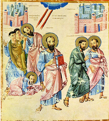 Деяния св. апостола Павла. Миниатюра В Деяниях описано четыре его миссионерских путешествия. Первое из них, относящееся к концу 40-х годов, началось и закончилось в Антиохии и проходило через кипрские города Саламин и Пафос, Пергию в Памфилии и Антиохию в Писидии, Иконию, Листру и Атталию. Спутником Павла в его апостольском служении был Варнава. Опору для проповеди Христа в городах Римской империи составляли находившиеся в них еврейские общины, в которые входили и прозелиты, обращенные из язычников. По словам протопресвитера Александра Шмемана, «Павел, входя в новый город, мог быть почти уверен, что найдет в нем еврейское субботнее собрание, в котором сможет проповедовать Христа “от Писаний”. По подсчетам историков, в этом рассеянии жило не меньше 4 миллионов евреев при общей цифре римского населения в 50 миллионов… В отличие от палестинских раввинов, все больше замыкавшихся в бесплодных и мелочных толкованиях закона, евреи рассеяния ощущали потребность объяснить свою веру внешнему миру, привести его к познанию истинного Бога, Творца неба и земли… Вот эта сеть синагог, покрывшая всю империю, и оказалась как бы провиденциально уготованным путем христианской проповеди». Приходя в город, апостол Павел посещал местную синагогу и там, опираясь на свидетельства пророков, проповедовал пришедшего в мир Мессию – Христа. Некоторые из слушавших его исполнялись веры, но большинство с негодованием отворачивалось от него как от вероотступника. В Деяниях неоднократно описывается подобное разделение.