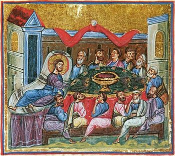Тайная вечеря (Иоанн 13: 1 - 20). Миниатюра из Евангелия и Апостола, XI в. Монастырь Дионисиат, Афон Начало истории Церкви Христовой восходит к Пятидесятнице, когда в Сионской горнице собрались вместе 12 учеников Спасителя: Симон Петр и брат его Андрей, сыновья Зеведеевы Иаков и Иоанн, Филипп и Варфоломей, мытарь Левий Матфей и Фома, Иаков Алфеев и Левей, прозванный Фаддеем, в Евангелии от Луки наименованный Иудой Иаковлевым, Симон Кананит, прозванный Зилотом, а также избранный жребием вместо отпавшего Иуды Матфий. Там, как об этом рассказано в Деяниях апостолов – главном источнике сведений о первых и важнейших событиях церковной истории, на них снизошел Святой Дух. Действием Его благодати они преобразились: до Пятидесятницы, во время земной жизни Христа и особенно после Его распятия, их вера в мессианство Учителя, их готовность пострадать вместе с Ним и за Него подвергалась колебаниям и изнемогала, не освобождала их от страха за собственную жизнь, но, приняв дары Святого Духа, они, как это зримо представлено в Деяниях, исполнились жертвенной решимостью нести людям благую весть о пришедшем в силе Царствии Небесном – о наступлении мессианского времени, о Новом Завете, которому с исполнением пророчеств уступает место Ветхий Завет, – не страшась уже никаких испытаний, страданий, самой смерти, готовые с радостью принести свою земную жизнь в жертву служению Слову. Если раньше апостолы, слушая наставления и притчи Учителя, не до конца понимали их, то после Пятидесятницы их разум просветился Божественным светом, и из их собственных уст исходили слова, исполненные силы и истины.