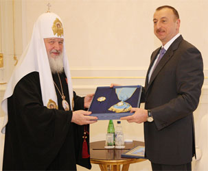 Святейший Патриарх Кирилл вручил Президенту Азербайджана одну из высших наград Русской Православной Церкви — орден «Славы и Чести» I степени. Этой награды удостаиваются главы государств и правительств, руководители международных и межправительственных организаций, главы Церквей и конфессий, выдающиеся государственные и общественные деятели за значительный вклад в межцерковное и межрелигиозное сотрудничество, в дело укрепления мира и дружбы между народами.