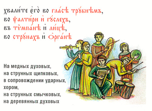 В трех других перечисляются музыкальные инструменты, использовавшиеся в ветхозаветном Богослужении (предлог в означает способ исполнения): во гласе трубнем (на духовых), хвалите Его во псалтири и гуслех (на струнных щипковых), в тимпане (в сопровождении ударных) и лице (хором), во струнах (на струнных смычковых) и органе (на клавишно-духовых). Кимвалы доброгласные и кимвалы восклицания – это один и тот же инструмент, медные тарелки: два эпитета лишь дополняют друг друга, характеризуя громкость.