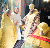 Владыке сослужили насельники монастыря и сотрудники Отдела религиозного образования и катехизации в священном сане.
