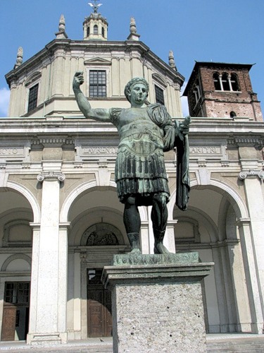 Памятник императору Константину в Милане Пробыв в Риме несколько месяцев, Константин отправился в Медиолан для встречи с Лицинием, на которой предстояло отпраздновать бракосочетание Лициния с сестрой Константина Констанцией, ранее уже помолвленными, и обсудить дальнейшие шаги по консолидации империи. Встреча состоялась в феврале 313 года. На совещании в Медиолане обсуждались вопросы о территориальном размежевании власти августов, о титуле Максимина (который не довольствовался званием цезаря, отверг дарованный ему его дядей Галерием и им же изобретенный титул сына августа (filius augusti) и в своих актах именовал себя августом – фактически Константин и Лициний в Медиолане обсуждали план совместных акций против него, о содержании которого можно лишь отчасти судить по последующим событиям, поскольку Максимин первым вступил в борьбу) и, наконец, о юридическом статусе христианских общин в империи и об основных принципах религиозной политики. Лициний признал фактически сложившееся после устранения Максенция положение дел с распределением провинций между ним и Константином, иными словами, отказался от претензий на Италию и Африку, а по поводу принадлежности Испании Константину не могло быть никаких разногласий уже в силу ее географического положения на крайнем западе Европы.