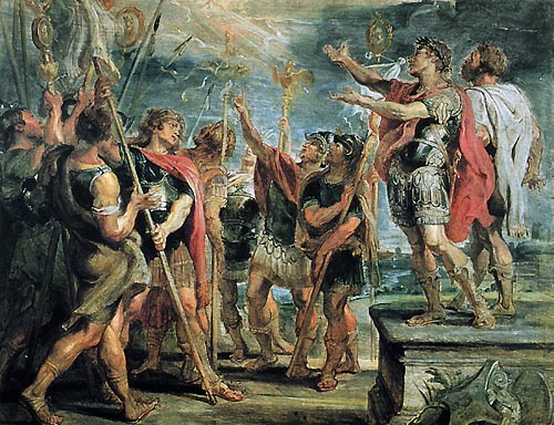 Рубенс. Видение императору Константину Реальность этого события – видения креста на небе самим Константином и его войсками и затем явление императору во сне Христа – отвергается многими историками, в том числе обыкновенно и историками Церкви из протестантской среды. По большей части основной мотив тут очевиден – он кроется в предубеждении против самой возможности чуда, а еще для протестантской традиции, не лютеровской, а восходящей к Кальвину, но усвоенной в позднейшие времена едва ли не всем протестантским миром, характерно негативное восприятие самого подвига Константина, не только даровавшего Церкви свободу, но и оказавшего ей покровительство, так что к нему, в конечном счете, восходит византийская симфония священства и царства, вызывающая солидарное отторжение на протестантском и постхристианском Западе.