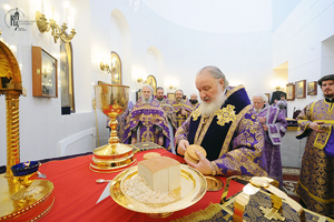 По окончании Литургии с приветствием к Предстоятелю Русской Православной Церкви обратился протоиерей Олег Воробьев. В память о совершенном сегодня богослужении отец Олег преподнес Его Святейшеству Библию, изданную в 1801 году, а учащиеся иконописной школы, действующей при храме, — список чудотворного Ярославского образа Божией Матери.