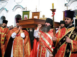 По окончании Божественной литургии под ликующие пасхальные песнопения и праздничный колокольный звон был совершен крестный ход с мощами преподобного вокруг Преображенского собора.