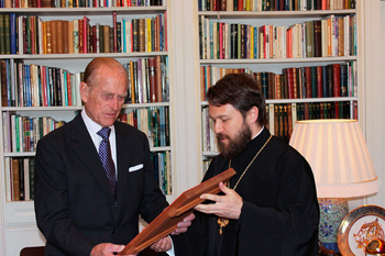 Митрополит Иларион поздравил принца с приближающимся 90-летием и подарил ему икону преподобномученицы Елисаветы Феодоровны, с которой британский королевский дом связан родственными узами. В ходе беседы, продолжавшейся около часа, председатель ОВЦС рассказал герцогу Эдинбургскому о возрождении Русской Православной Церкви в последние 20 лет, в том числе о восстановлении и строительстве монастырей в России, Украине, Белоруссии, Молдавии и других странах, входящих в каноническую юрисдикцию Московского Патриархата. Была отмечена важная роль монастырей не только в духовном воспитании иноков и мирян, но и в охране окружающей среды.