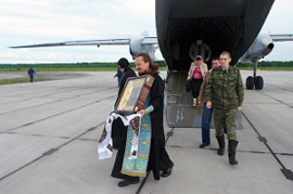 По словам иерея Святослава Шегая, сопровождающего святыню в Архангельской епархии, на аэродроме в это время проходили учебные полеты, и командир части предложил поднять икону на борт самолета. С чудотворным образом на борту АН-26 облетел вокруг города. Икона находилась в воздухе около получаса; за это время на борту был отслужен молебен.