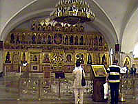 Именно эти идеи осмысляются и продолжают развиваться в нижней Преображенской церкви. Она тоже оказалась посвящена Господу, о чем свидетельствует и освящение главного престола во имя Преображения, и иконы Земной Жизни Спасителя, пребывающие здесь. Так же, как и «верхний» храм, нижняя церковь посвящена Богоизбранной России, хранимой под сенью Христа Спасителя. Русская история здесь тоже представляется как часть Вселенской Священной истории от крещения Руси и до наших дней, о чем свидетельствуют многочисленные иконы вселенских и русских святых, в том числе живших и после освящения храма Христа Спасителя, и Новомучеников, прославленных в наше время. Особая милость Пресвятой Богородицы, явленная России в ее истории, и в последующий после 1883 года период, выражена во множестве хранимых здесь икон Богоматери — Тихвинской, Смоленской, Знаменской, Августовской. Престолы нижнего храма обращают мысль последовательно к Господу, Богоматери и святому Вселенской Церкви, но в Тихвинской иконе Византия и Русь слились в преемственное целое.