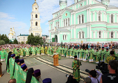 Нынешний год знаменателен для Серафимо-Дивеевского монастыря тремя юбилейными датами: 150-летием со дня его основания, 20-летием возрождения обители и 20-летием второго перенесения святых мощей преподобного Серафима Саровского. В связи с этим на праздничное богослужение собрались несколько тысяч верующих. Для удобства молящихся Литургия транслировалась на экране, установленном на Соборной площади.