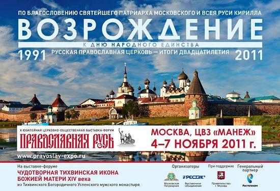 По благословению Святейшего Патриарха Московского и всея Руси Кирилла c 4 по 7 ноября 2011 года в Москве в центральном выставочном зале «Манеж» пройдет X Церковно-общественная выставка-форум «Православная Русь ― к Дню народного единства. Русская Православная Церковь ― итоги двадцатилетия: 1991-2011 годы».
