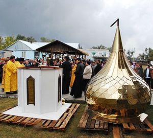 Спасо-Преображенский Центр реабилитации в Ставрополе - один из первых в России. На фото - освящение купола храма Преображения Господня, строящегося на территории Центра в станице Темнолесской, октябрь 2011г.