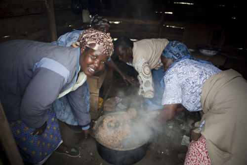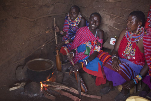 В отличие от многих других племён, у масаи женщины занимают важное место в культуре и жизни племени. Их легко отличить по выбритой голове, ярким одеждам и бусам. На фото: девушки дезинфицируют дымом сосуды из тыквы для молока. После такой обработки молоко в них хранится два-три дня при температуре на улице 27-30 градусов