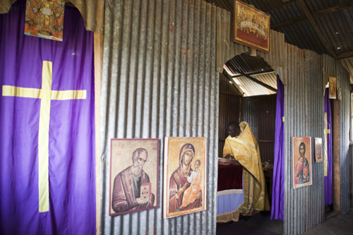 Храм отца Марка построен из гофрированного железа, пол земляной, электричества нет