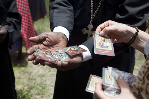 И к моему большому удивлению оказалось, что большинство масаев — христиане. Среди них есть даже и православные. Как рассказал мне отец Марк, он знает как минимум четырех православных священников из племени масаев. На фото: масайская женщина дарит отцу Марку нагрудный крест, который они сплели из бисера к его приезду