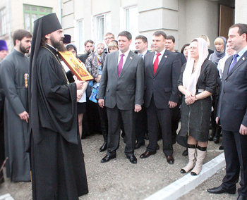 За торжественным молебном во время открытия центра епископу Феофилакту сослужили благочинный церквей Кисловодского округа протоиерей Иоанн Знаменский и клирики храмов города Ессентуки.