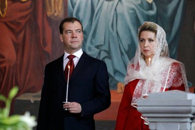 Дмитрий и Светлана Медведевы присутствовали на пасхальном богослужении в храме Христа Спасителя. Праздничную службу возглавил Патриарх Московский и всея Руси Кирилл.
