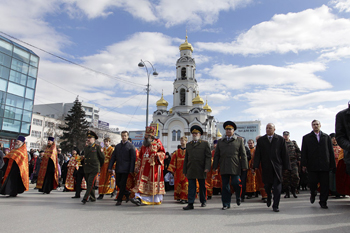 После ночной пасхальной службы и краткого отдыха священнослужители екатеринбургской епархии во главе с митрополитом Кириллом и многочисленные горожане вновь собрались в Кафедральном Свято-Троицком соборе.