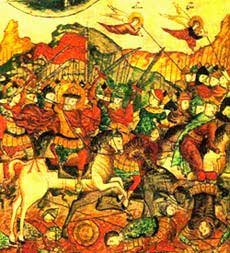 И после этого в девять часов дня воззрел Господь милостивыми очами на всех князей русских и на мужественных воевод, и на всех христиан, дерзнувших встать за христианство и не устрашившихся, как и подобает славным воинам. Видели благочестивые в девятом часу, как ангелы, сражаясь, помогали христианам, и святых мучеников полк, и воина Георгия, и славного Дмитрия, и великих князей тезоименитых – Бориса и Глеба. Среди них был и воевода совершенного полка небесных воинов – архистратиг Михаил. Двое воевод видели полки поганых, и трисолнечный полк, и огненные стрелы, летящие на них; безбожные же татары падали, объятые страхом Божиим и от оружия христианского. И воздвиг Бог десницу нашего князя на одоление иноплеменников. А Мамай, в страхе затрепетав и громко восстенав, воскликнул: «Велик Бог христианский и велика сила Его! Братья измаильтяне, беззаконные агаряне, бегите не готовыми дорогами!» И сам, повернув назад, быстро побежал к себе в Орду. И, услышав об этом, темные его князья и властители тоже побежали. Видя это, и прочие иноплеменники, гонимые гневом Божиим и одержимые страхом, от мала до велика, обратились в бегство. Христиане же, увидев, что татары с Мамаем побежали, погнались за ними, избивая и рубя поганых без милости, ибо Бог невидимою силою устрашил полки татарские, и, побежденные, обратились они в бегство. И в погоне этой одни татары пали под оружием христиан, а другие в реке утонули. И гнали их до реки до Мечи, и там бесчисленное множество бегущих побили. Князья же гнали полки содомлян, избивая, до стана их, и захватили большое богатство, и все имущество их, и все стада содомские.
